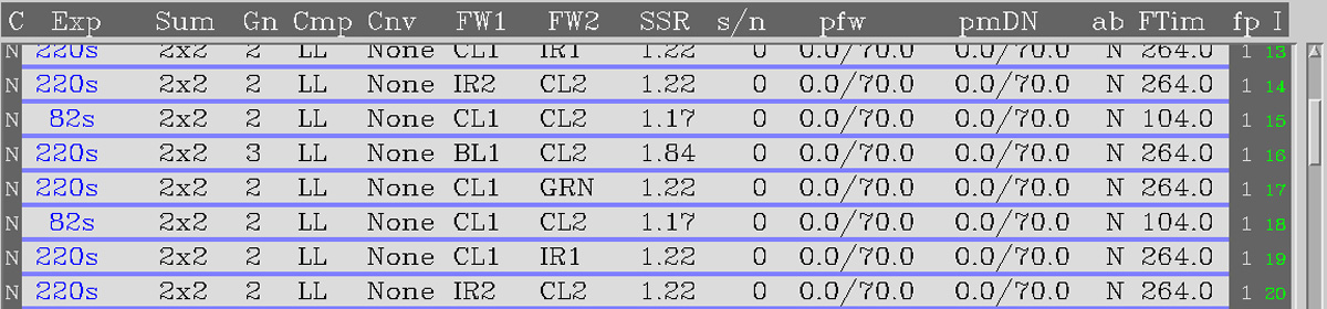 The header image of this webpage shows an example screenshot of the ISS planning tool for an observation of irregular moon Siarnaq in orbit 200. Each row is one image (one shutter activity). FTim (to the right) indicates the total frame time (in seconds) for each individual image. CL1 and CL2 are panchromatic “clear” filters with the broadest throughput of all available filters at wavelengths from near-UV to near IR. SSR indicates the predicted data usage (in megabits).