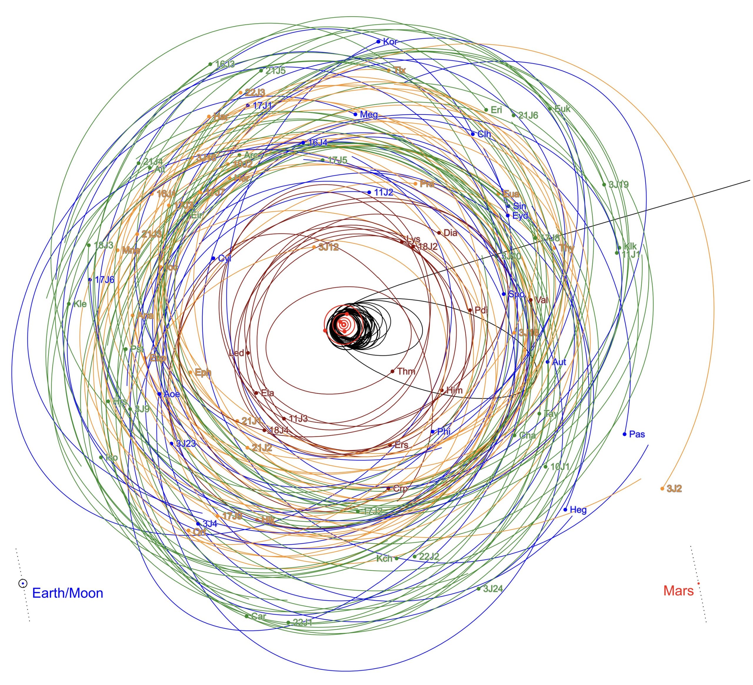 | Pasiphae | 508 | retrograde | 16.9 | 10.2 | 3.8–5.0 | 58 | ? | 23.47 | 0.41 | 148 | 743.6 | Pas |